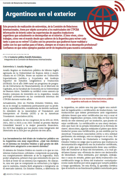 Otra tarea importante que hemos venido realizando es entrevistar a figuras argentinas destacadas de la traducción y la interpretación que actualmente se desempeñan en el exterior, no solo para mantener al día a nuestros matriculados con respecto a los diferentes contextos en que se ejerce la profesión, sino, especialmente, para inspirarlos, para que reconozcan los enormes desafíos que esos profesionales tuvieron que enfrentar y resolver y para que puedan darles el reconocimiento que se merecen.